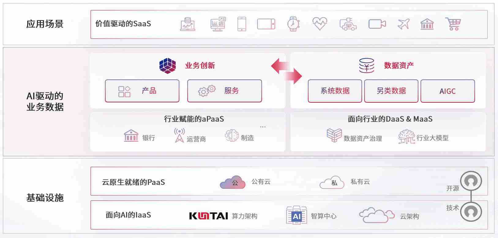 数字时代,,,,围绕企业数字化转型的关键要素,,,,尊龙旗舰厅数码开创性的提出数云融合战略和技术体系框架,,,着力在云原生、、数字原生、、、AI原生和信创产业上架构产品和服务能力,,,,为处在不同数字化转型阶段的快消零售、、汽车、、、金融、、、医疗、、、政企、、教育、、运营商等行业客户提供泛在的敏捷IT能力和融合的数据驱动能力,,,,构建跨界融合创新的数字业务场景和新业务模式,,助力企业级客户建立面向未来的核心能力和竞争优势,,,,全面推动社会的数字化、、智能化转型升级。。。