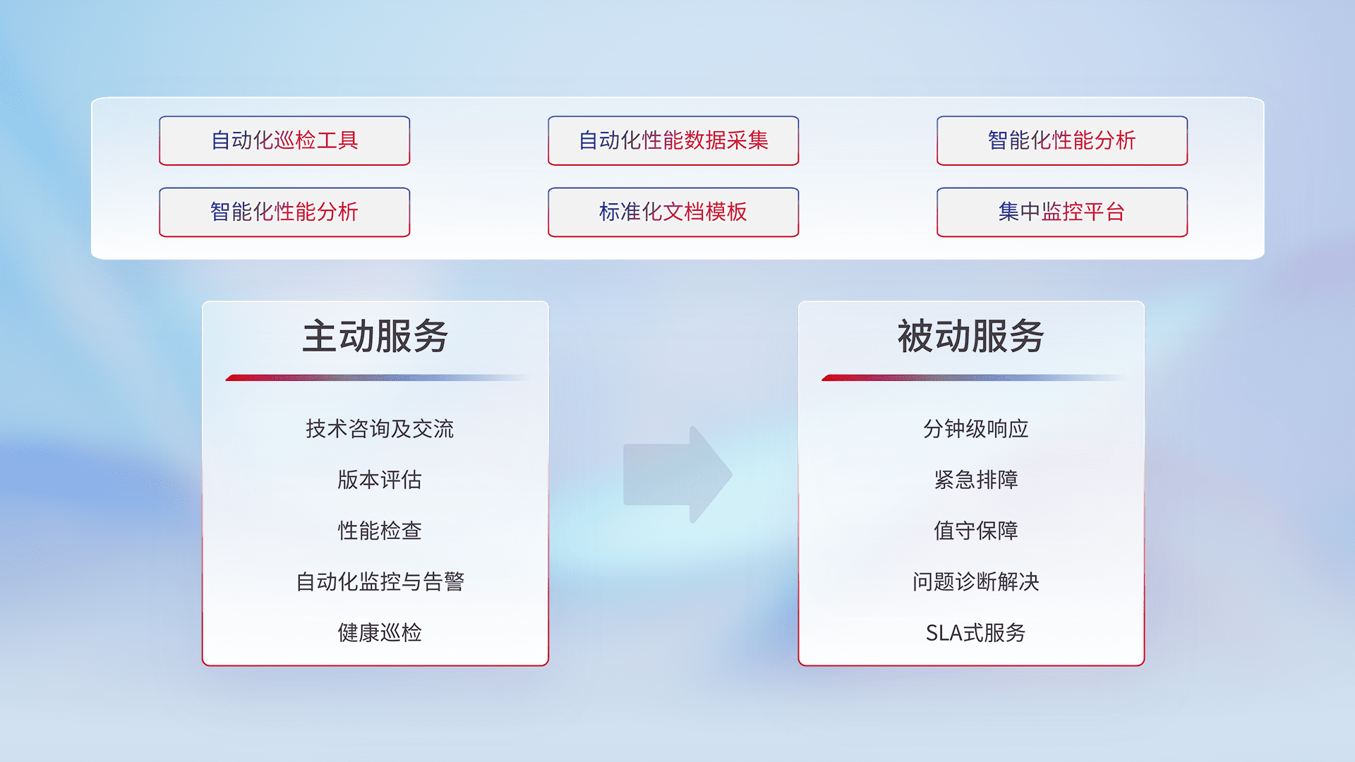 智能化工具和标准化文档,,保障服务质量,,,,提供主动服务(包含技术咨询、、版本评估、、、性能检查、、、自动化监控与告警、、、健康巡检)和被动服务包含(分钟级响应、、、紧急排障、、、值守保障、、、问题诊断解决、、、SLA服务)。。。。